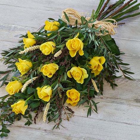 A dozen roses contrast beautifully with silvery eucalyptus foliage and natural elements including dried wheat, natural birch and a raffia bow.