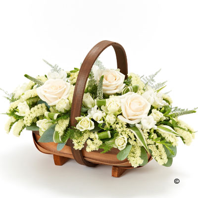 A traditional trug basket filled with roses, veronica, statice and scented freesias in fresh white with green foliage.