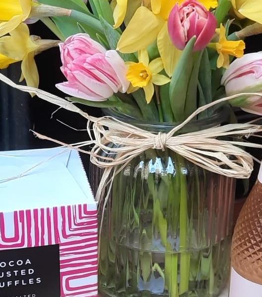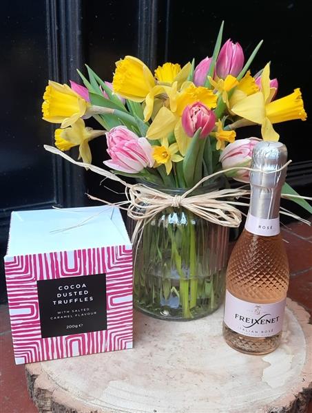Celebrate Mum with a joyful spring arrangement of fresh daffodils and tulips in a vase, paired with a mini bottle of prosecco and a delicious box of chocolates – the perfect way to make her feel truly appreciated this Mother’s Day.