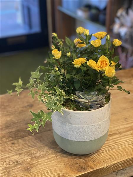 Bring elegance and greenery into any space with our Trio Planter. This charming ceramic pot features a delicate rose, trailing ivy, and a hardy succulent—combining colour, texture, and low-maintenance beauty in one stylish arrangement. Perfect for desks, shelves, or gifting to someone special.