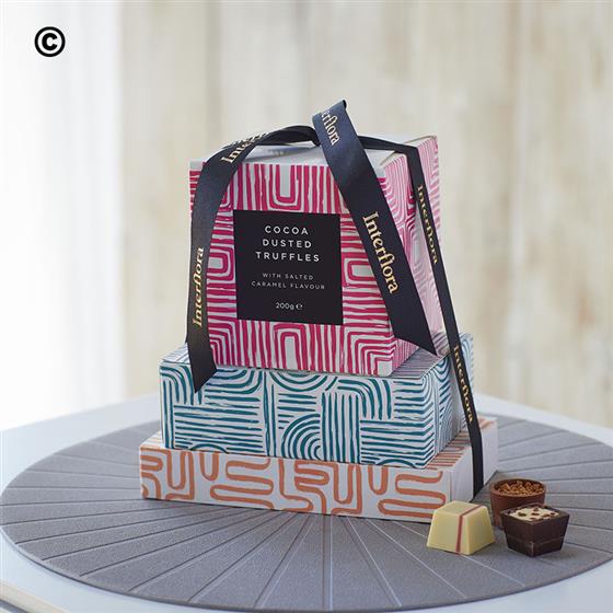 A trio of gourmet chocolate boxes.One filled with cocoa dusted salted caramel flavour truffles and two featuring rich filled chocolates each bursting with flavours including honey caramel, sumptuous praline, and cherry ganache. One for the true chocoholics.