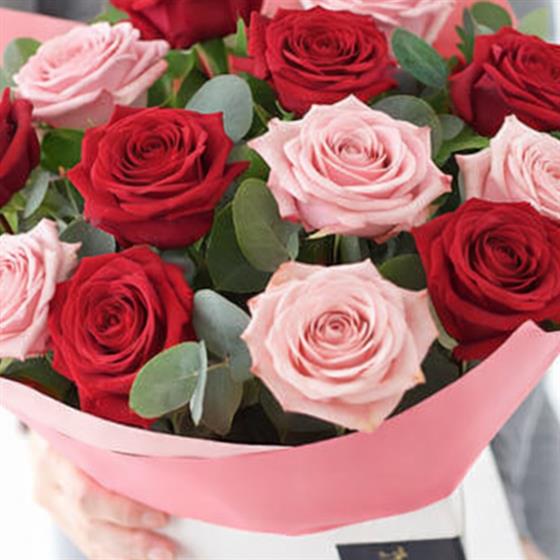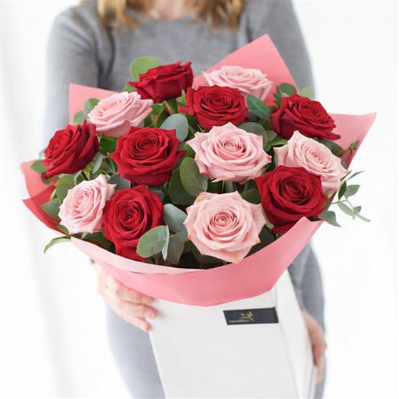 12 of the most luxurious red and pink roses, large headed and hand picked for their quality and beauty.