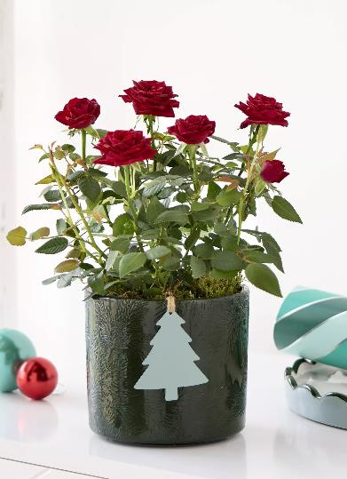 We love the rich red of this merry rose, it goes beautifully with the contrasting deep green hues of the ceramic pot. And it comes with a cute Christmas tree gift tag too.